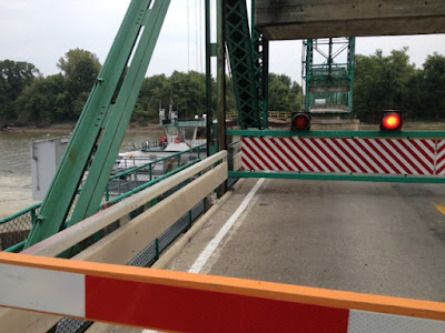 When we came to the Mississippi, we found that the bridge was up - it's a drawbridge. A barge was coming through. We were the lead car on the bridge, so I got some pix: